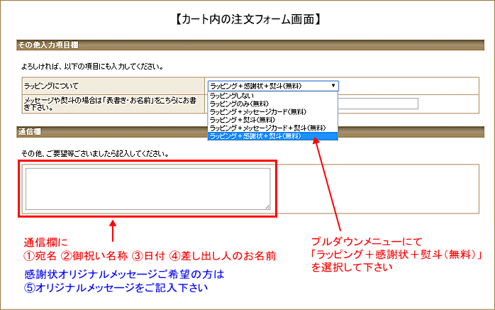 大正琴をご注文の際、カート内の注文フォーム画面一番下の【その他入力項目欄】にてプルダウンメニューにて「ラッピング+感謝状+熨斗(無料)」を選択して、【通信欄】に必要事項をご記入下さい。 |